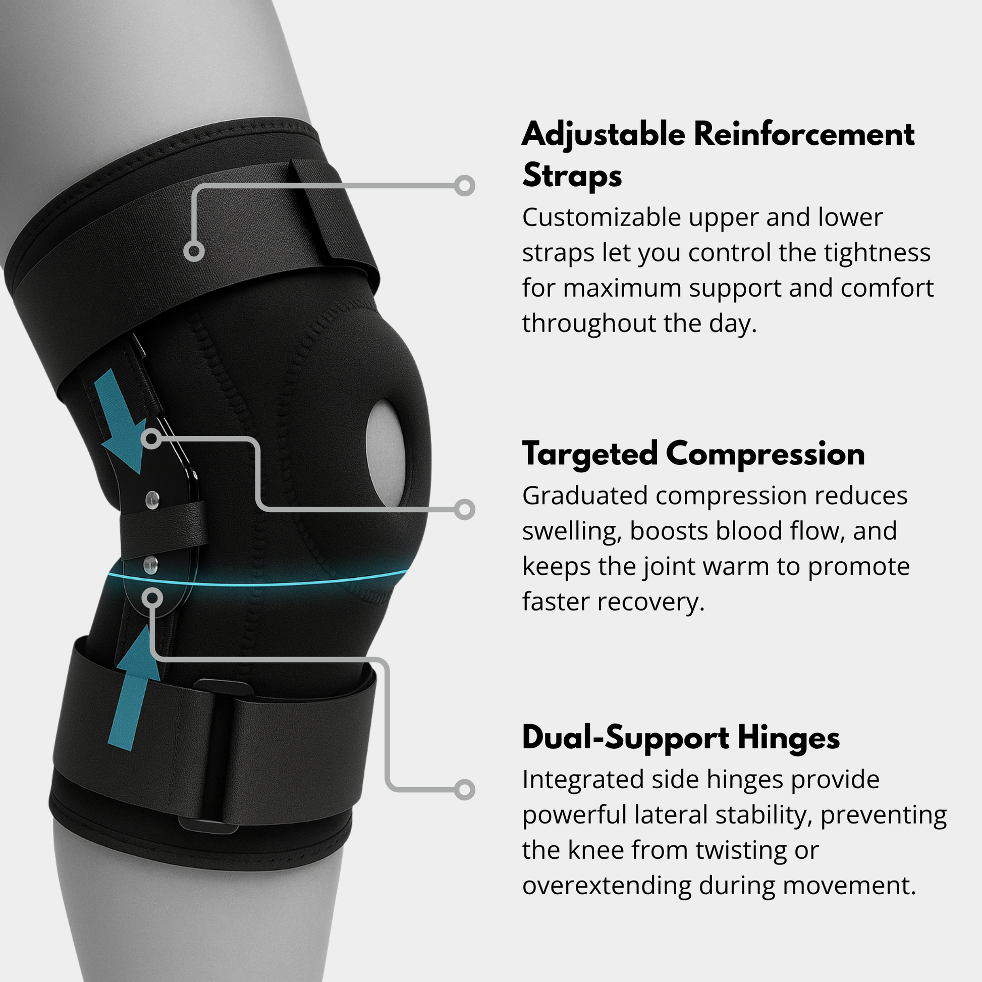 Built with reinforced side hinges and adjustable compression straps, it delivers targeted stability without limiting motion, keeping your knee protected, balanced, and pain-free throughout the day.